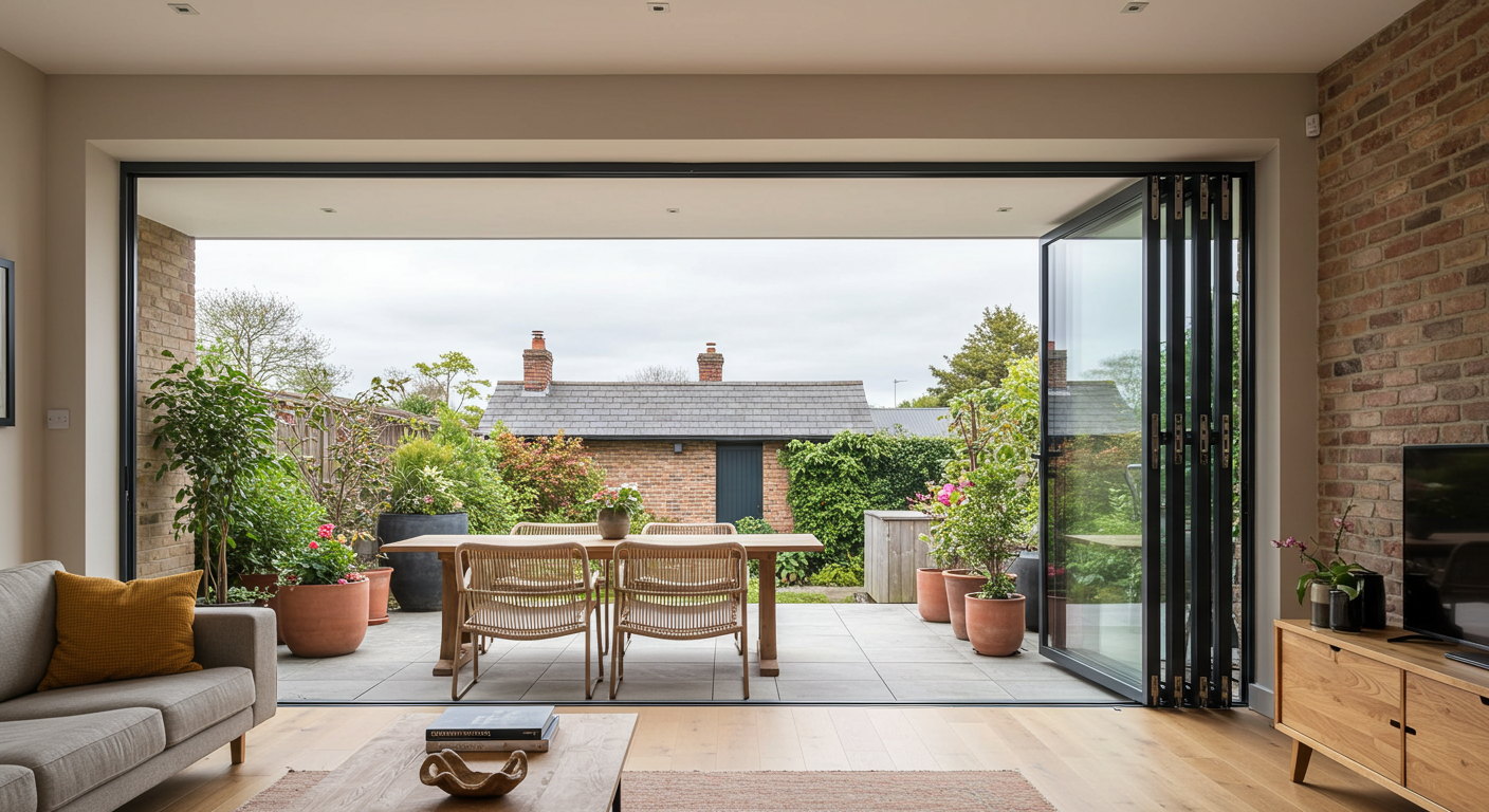 유리 벽처럼 접히는 문 형태로 확장형 테라스, 실내외 연결에 사용.