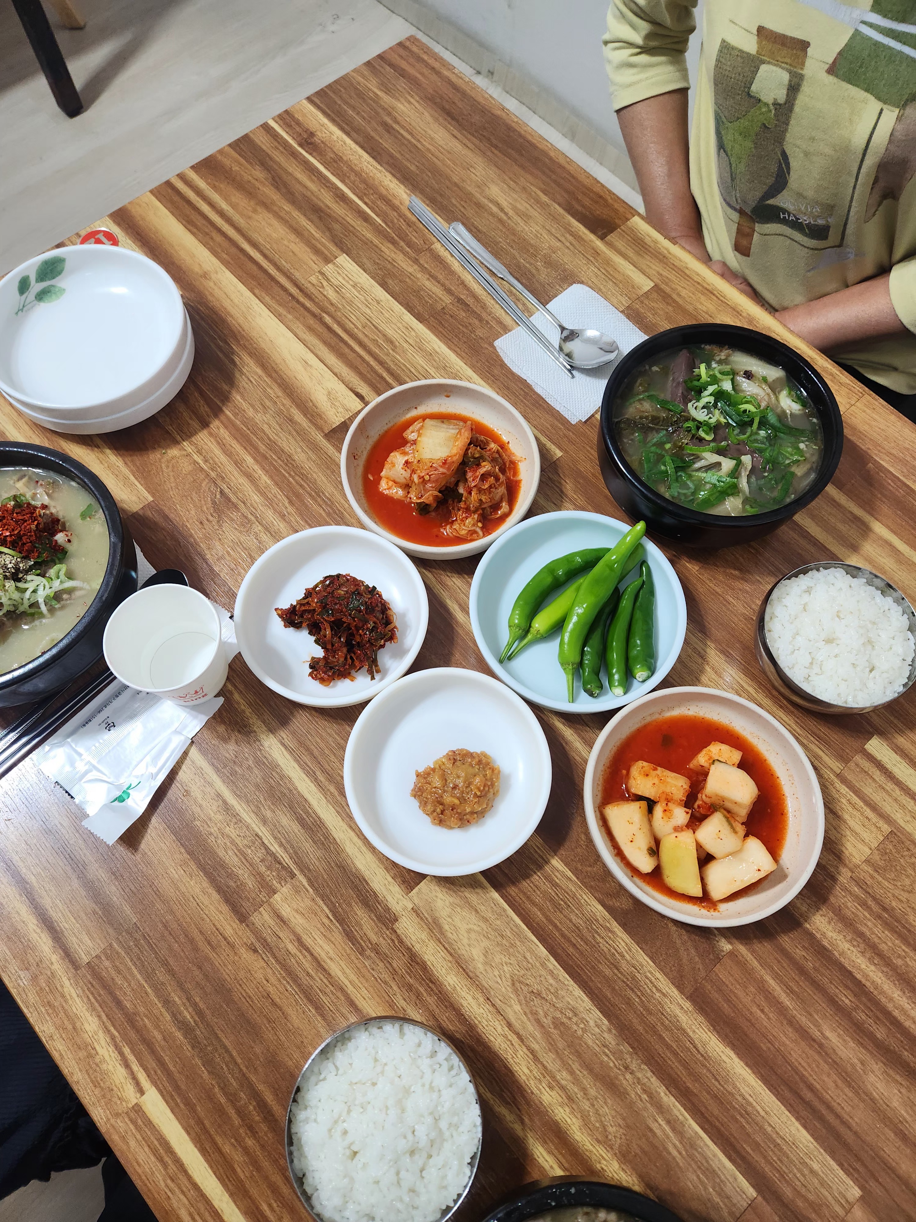 각 해장국은 기본 반찬 세트(깍두기, 김치, 고추, 다대기 등)와 함께 제공돼요.