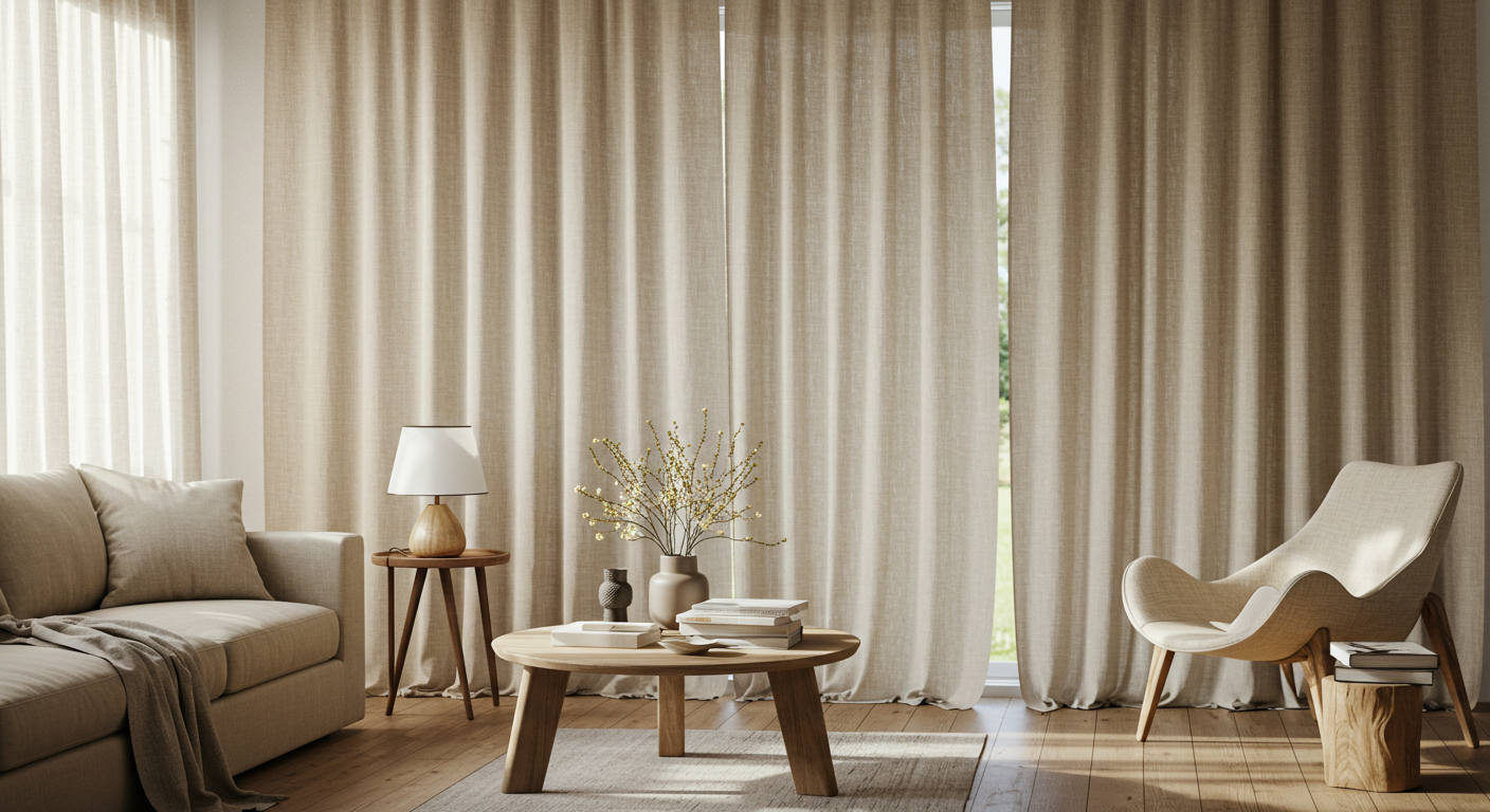 예: 아이보리 벽에는 베이지나 모카 컬러 커튼 - 주름 간격과 밀도도 중요