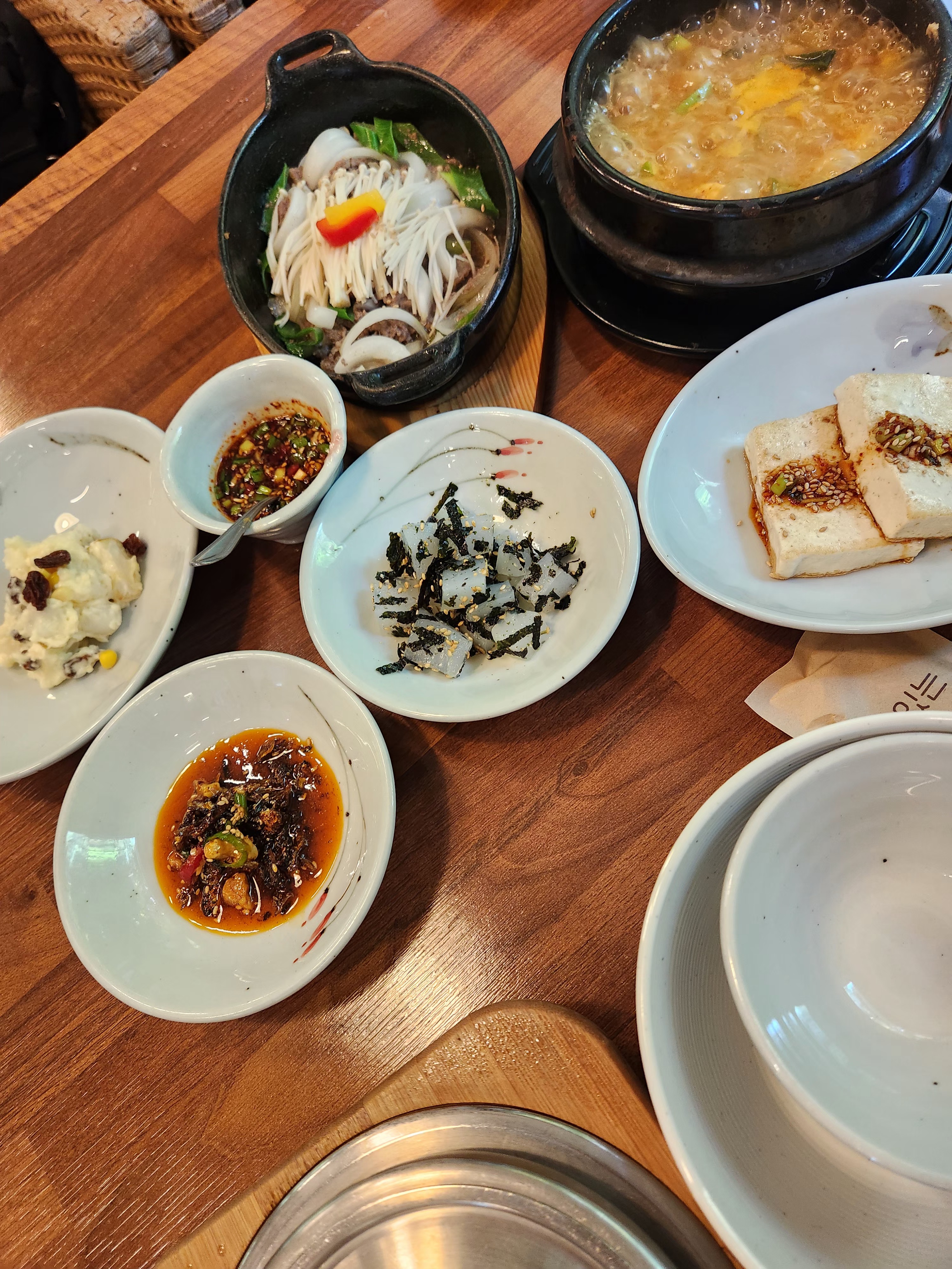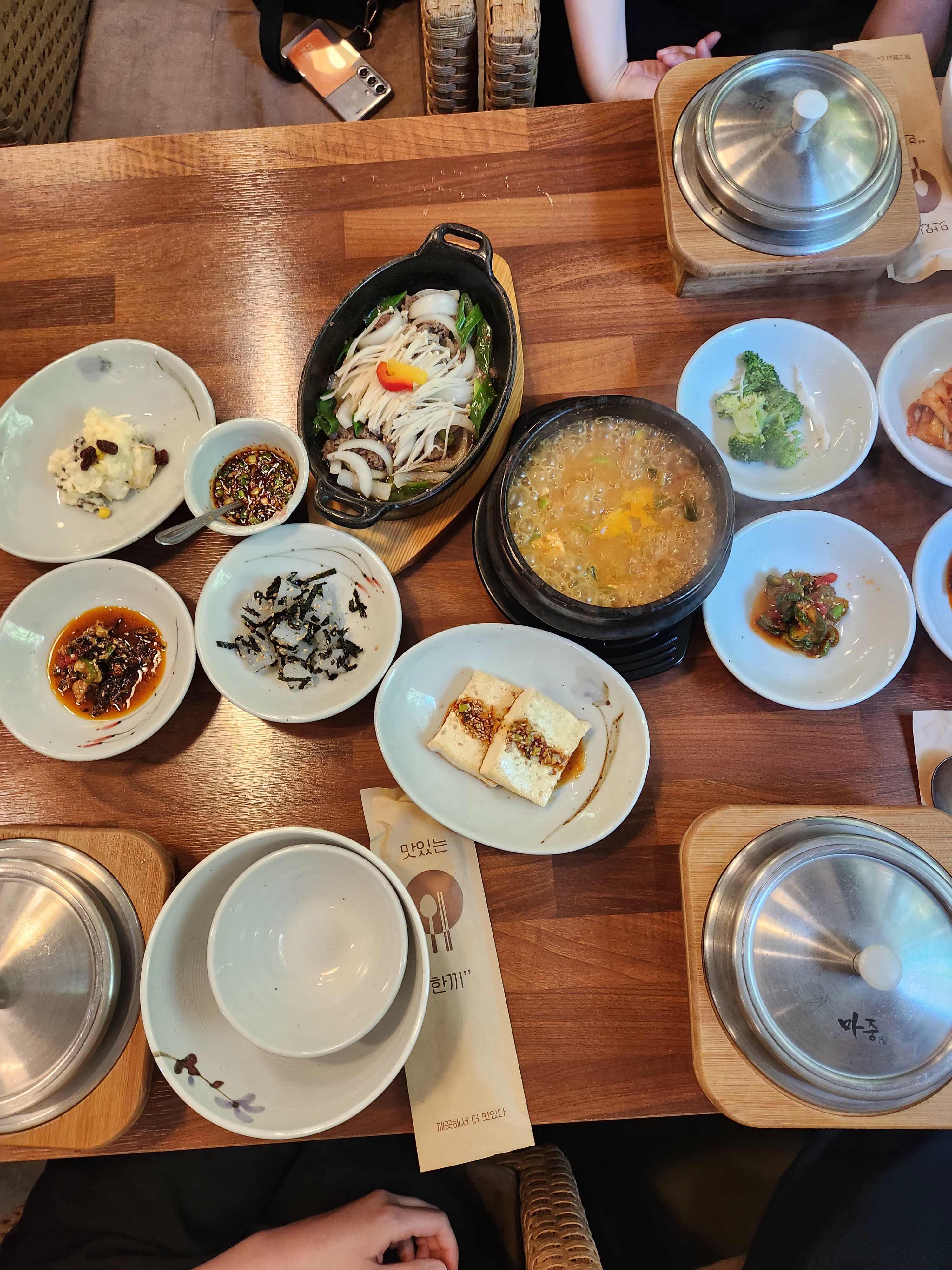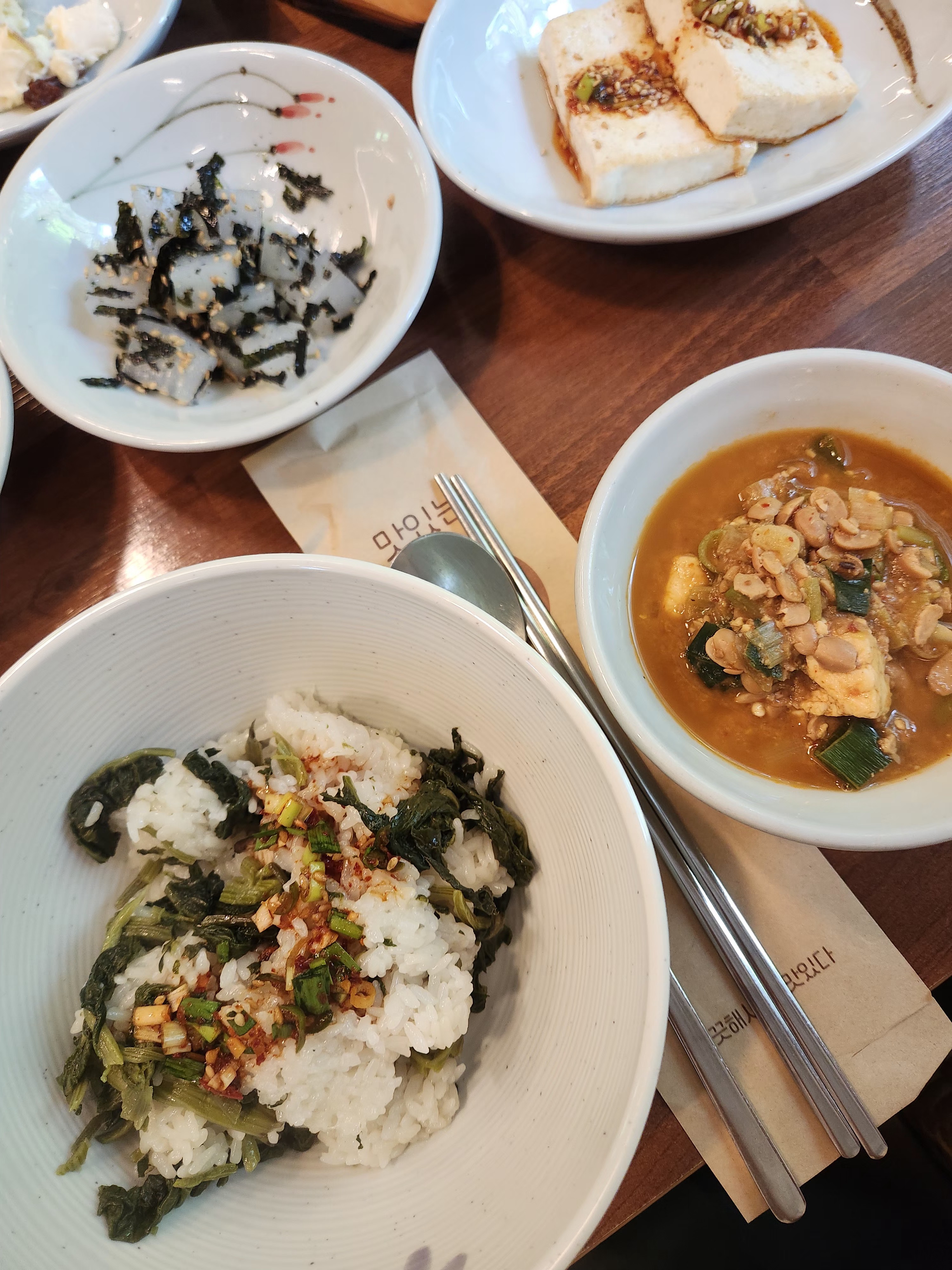 반찬은 나물무침, 두부조림, 멸치볶음, 계란찜, 김치 등이 깔끔하게 나왔고,